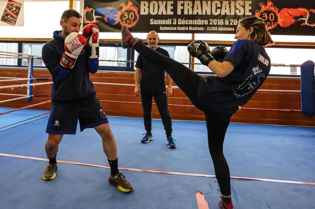 Arthur, qui espère se faire une place dans l’élite en combat, s’entraîne avec sa sÅ“ur Lory, sous le regard de leur champion de père Laurent. © Le Maine Libre