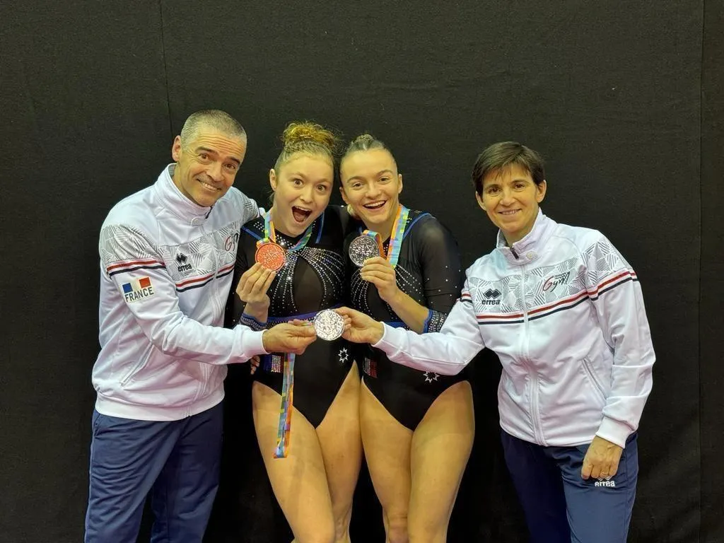 Candy Brière-Vetillard et Maëlie Abadie, médailles au cou et entourées de leurs coachs, Romuald et Virginie Abadie. © Accro Sarthe