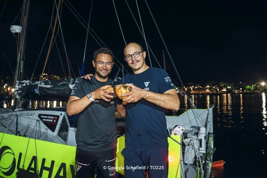 Le Sarthois Lomano Takasi et son co-skipper Jean Marre, à l’arrivée de la Transat Café L’Or, le 21 novembre 2025. © Georgia Schofield/TCO25